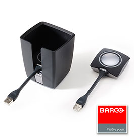 ClickShare, hace que conectarse al sistema de vídeo de la sala de reuniones sea solo cuestión de presionar un botón. Esta asombrosa tecnología de botón ayuda al ponente a realizar fácilmente la presentación en pantalla y favorece la participación activa de los asistentes.
